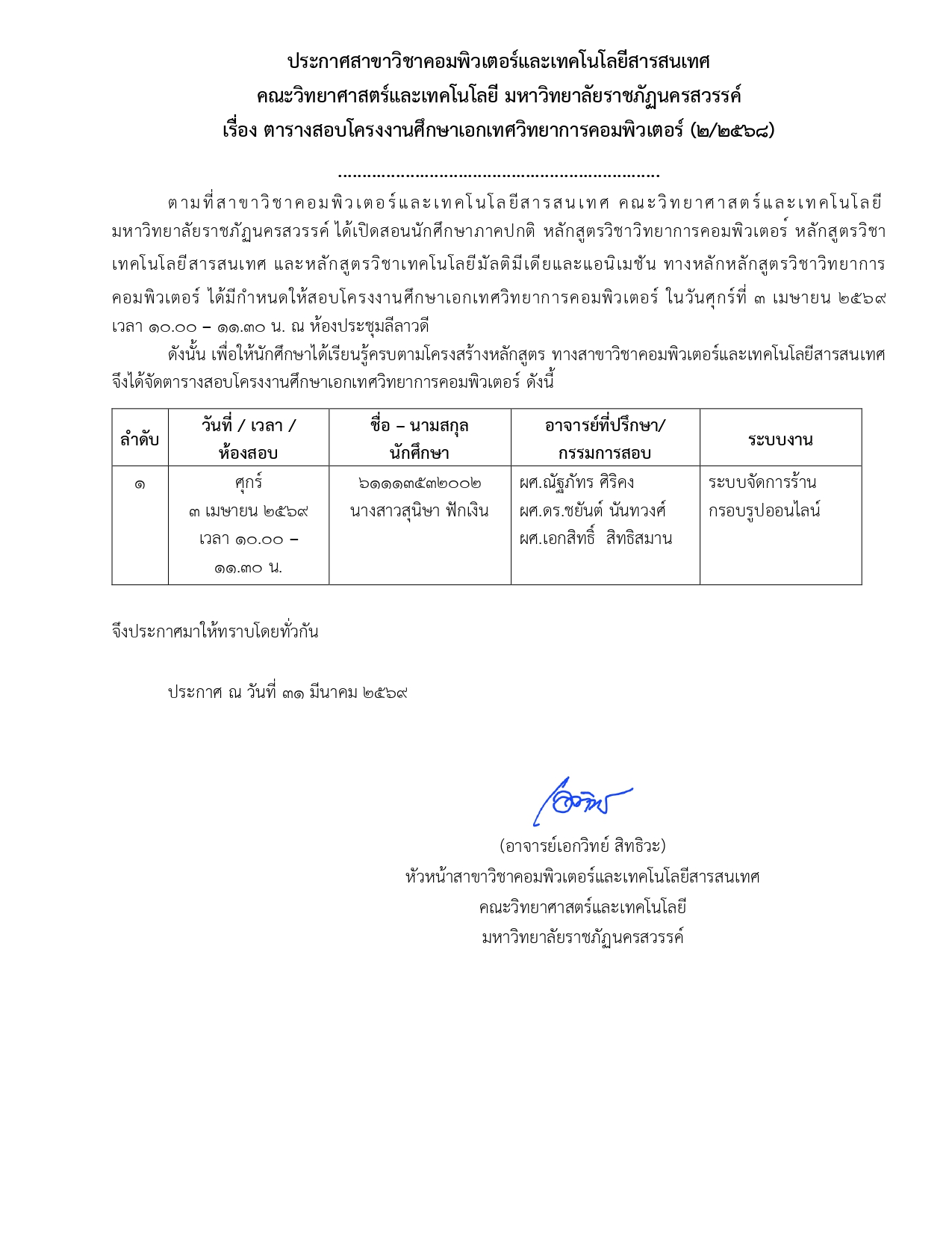ประกาศสาขาวิชาคอมพิวเตอร์และเทคโนโลยีสารสนเทศ เรื่องตารางสอบโครงงานการศึกษาเอกเทศ